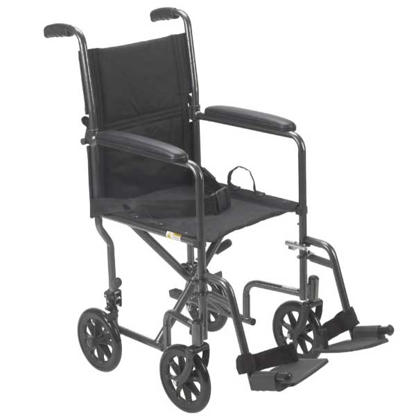 This lightweight Steel Transport Chair with Fixed Full Arms or Detachable Desk Arms by Drive Medical has a foldable back, making it convenient and easy to store and transport. The silver vein frame is scratch resistant and it comes standard with a comfortable, durable, and easy to clean, black nylon upholstery seat and back. The 8″ caster wheels in front and rear with provide a smooth ride over most surfaces. The padded armrests, rear wheel locks, swing away footrest and seat belt all combine to make this transport chair convenient, durable, easy to transport and safe.